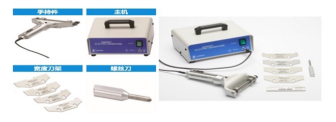 Zimmer電動植皮刀是一種以電驅動的植皮移植用器械。取皮的厚度范圍從 0 到0.030 英寸(0.75 毫米) ,以0.002 英寸(0.050 毫米)為取皮增量。共有 5 種可選的寬度刀架,所對應的移皮寬度分別為 1 英寸、 1.5 英寸、2 英寸、3 英寸和 4 英寸(即 2.5 厘米、3.8 厘米、5.1 厘米、7.6 厘米和 10.2 厘米) 。